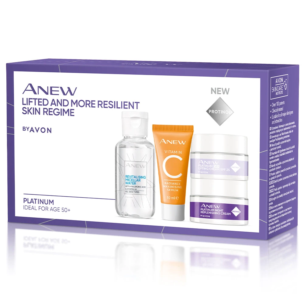 Try your perfect mini skincare set today for visible results in just 2 days. The Anew Platinum Lifted & More Resilient Skin Regime includes mini editions of our Revitalising Micellar Water, Radiance Maximising Serum and Platinum Day and Night Cream featuring Protinol™ Technology for a dual collagen boost.