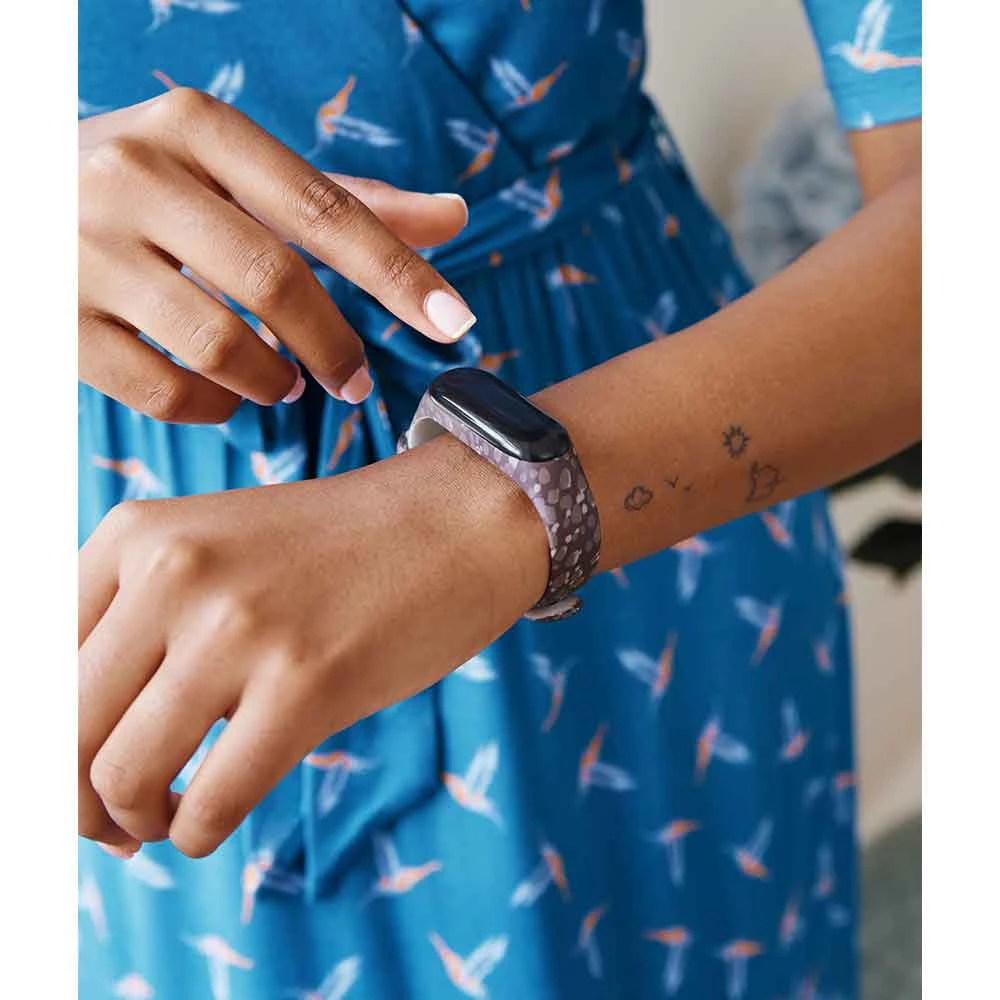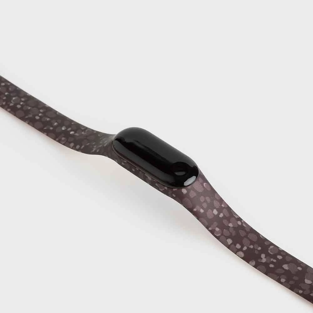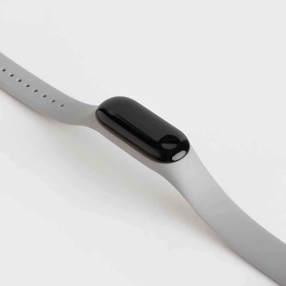 Silicone strap, adjustable between 12.5cm and 20cm. Comes with a rechargeable, non-replaceable lithium battery and charging cable.
