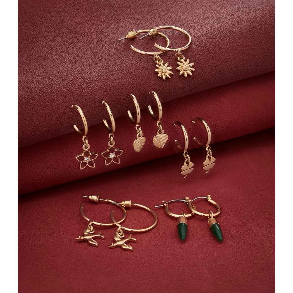 6 pairs of gold-plated hoop earrings with enamel, textured and polished charms. Certified by AnchorCert as suitable for sensitive skin.